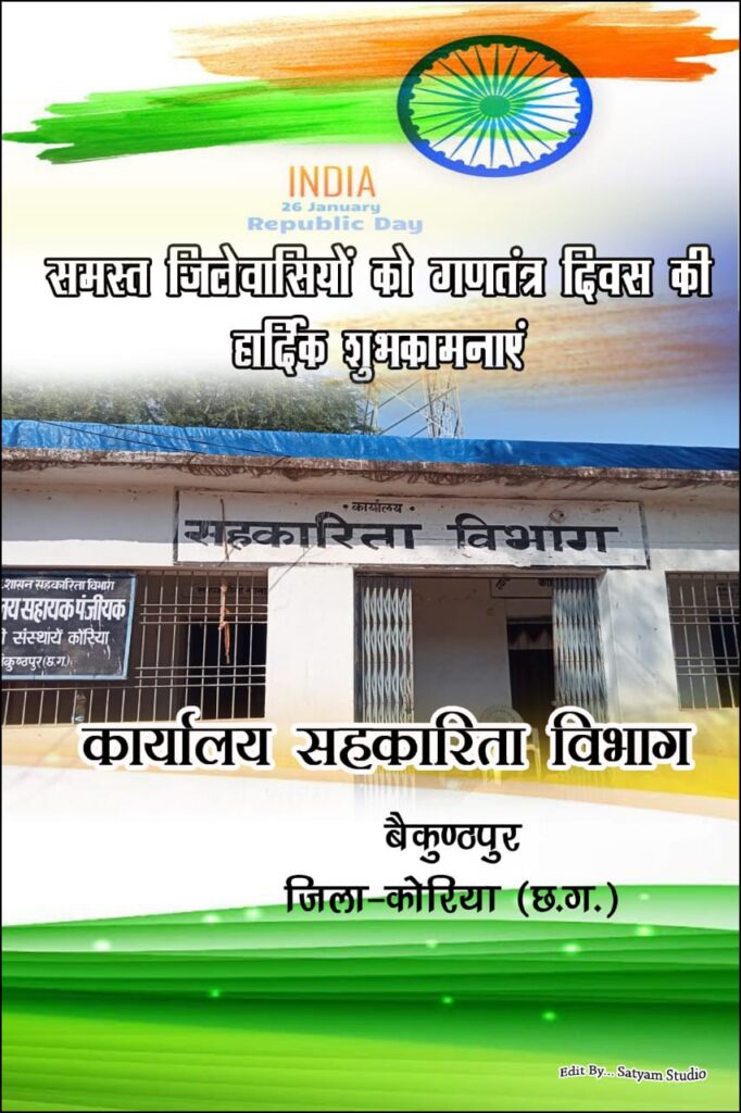 सहकारिता विभाग जिला कोरिया बैकुंठपुर की ओर से समस्त क्षेत्रवासियों को गणतंत्र दिवस की हार्दिक शुभकामनाएं