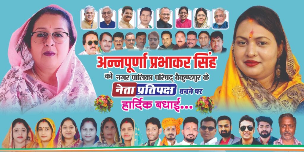 नगर पालिका परिषद बैकुंठपुर के अंतर्गत सर्वांगीण विकास को लेकर मैं प्रतिबद्ध हूं , नगर पालिका क्षेत्रांतर्गत क्षेत्र की अंतिम जनता तक मैं शिकायत एवं सुझाव हेतु हर समय उपस्थित हूं -श्रीमती अन्नपूर्णा प्रभाकर सिंह।। आम जनता की समस्याएं को प्रमुखता से हमेशा मैं उठाते रहूंगी मैं समस्त नगर पालिका परिषद के निर्वाचित पार्षदों का हृदय से आभार व्यक्त करती हूं कि उन्होंने मुझे जो जिम्मेदारी दी है और मैं इस जिम्मेदारी को पूरी निष्ठा एवं ईमानदारी पूर्वक निभाने की भरपूर कोशिश करूंगी