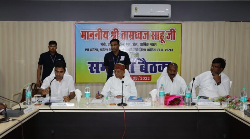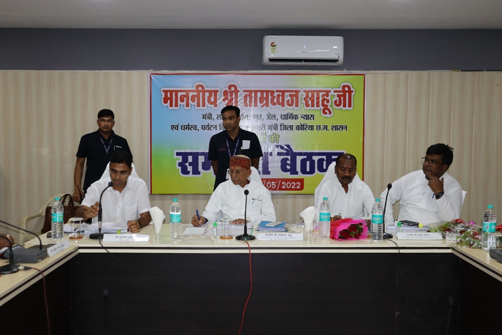 कोरिया, 02 मई 2022/लोक निर्माण, गृह, जेल, धार्मिक न्यास एवं धर्मस्व, पर्यटन मंत्री एवं जिले के प्रभारी मंत्री श्री ताम्रध्वज साहू ने सोमवार को जिला प्रवास पर जिला स्तरीय अधिकारियों के साथ समीक्षा बैठक कर शासन की जनकल्याणकारी योजनाओं के जिले में क्रियान्वयन की जानकारी लेकर चर्चा की। इस दौरान सरगुजा विकास प्राधिकरण उपाध्यक्ष एवं भरतपुर-सोनहत विधायक श्री गुलाब कमरो एवं मनेन्द्रगढ़ विधायक डॉ. विनय जायसवाल, नगरनिगम चिरमिरी महापौर श्रीमती कंचन जायसवाल एवं स्थानीय जनप्रतिनिधि, कलेक्टर श्री कुलदीप शर्मा, पुलिस अधीक्षक श्री प्रफुल्ल ठाकुर, जिला पंचायत सीईओ श्री कुणाल दुदावत सहित प्रशासनिक अमले के अधिकारी-कर्मचारी मौजूद रहे।