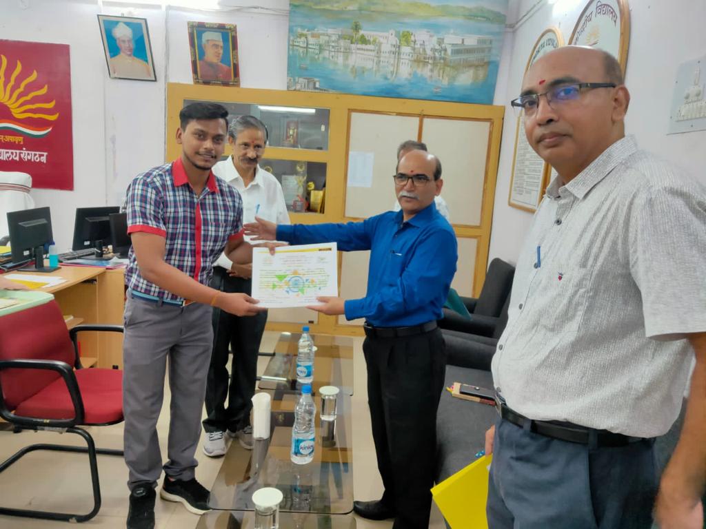 केंद्रीय विद्यालय झगराखांड के कक्षा 12वीं के छात्र शुभम गुप्ता ने कला उत्सव 2020-21 व 2021-22 में एकल शास्त्रीय तबला वादन कर लगातार दोनों वर्ष प्रदेश में प्रथम स्थान हासिल किया और राष्ट्रीय स्तर पर दिल्ली में आयोजित कार्यक्रम ‘आजादी के अमृत महोत्सव’ में प्रस्तुति दिया.शुभम की इस उपलब्धि के लिये डिप्टी कमिश्नर श्री विनोद कुमार केंद्रीय विद्यालय संगठन रायपुर ने 25.06.2022 शनिवार को प्रशस्ति सह प्रमाण पत्र देकर सम्मानित किया.इस अवसर पर केंद्रीय विद्यालय झगराखांड प्राचार्य श्री वाई.के.सोलंकी,श्री एन.के.सिन्हा प्राचार्य अंबिकापुर केवी,श्री रमाकांत कौशिक प्राचार्य बैकुंठपुर केवी व संगीत शिक्षक श्री बी.रवींद्र कुमार उपस्थित रहे.इस उपलब्धि के लिए प्राचार्य श्री सोलंकी,मित्रों व शुभचिंतकों ने शुभम को बधाई व शुभकामनाएं दी हैं.बता दें शुभम नगर के गायक व कवि श्री रमेश गुप्ता के सुपुत्र हैं,जो वर्तमान में शासकीय हाई स्कूल पस्ता जिला सूरजपुर में प्रभारी प्राचार्य के रूप में कार्यरत हैं.शुभम ने अपनी इस उपलब्धि व सफलता का श्रेय तबला गुरु श्री मुन्नालाल,संगीत शिक्षक श्री बी.रवींद्र कुमार,माता-पिता,शिक्षकों,शुभचिंतकों व मित्रों को दिया है.