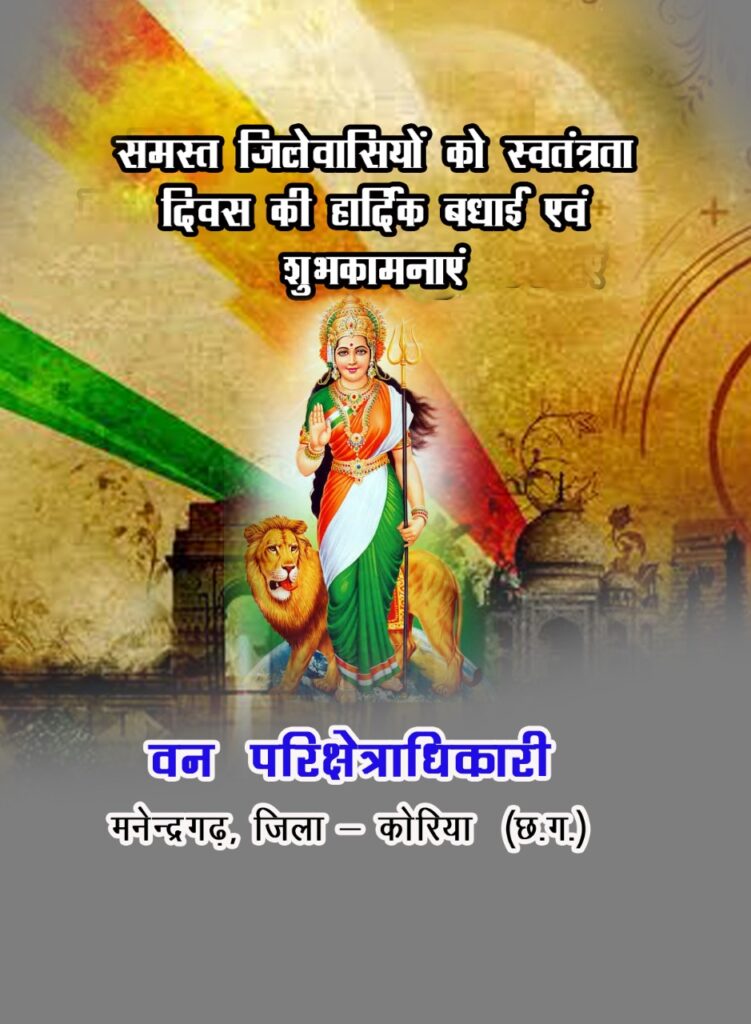 new कोरिया छत्तीसगढ़ वन परीक्षेत्राधिकारी मनेंद्रगढ़ जिला कोरिया की ओर से समस्त अधिकारी कर्मचारी एवं क्षेत्र की जनता जनार्दन को स्वतंत्रता दिवस की हार्दिक शुभकामनाएं August 14, 2022August 14, 2022 Kamrun Nisha 0 Comments कमरून निशा स्टेट हेड वन परीक्षेत्राधिकारी मनेंद्रगढ़ जिला कोरिया की ओर से समस्त अधिकारी कर्मचारी एवं क्षेत्र की जनता जनार्दन को स्वतंत्रता दिवस की हार्दिक शुभकामनाएं WhatsApp Facebook Twitter LinkedIn
