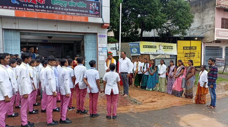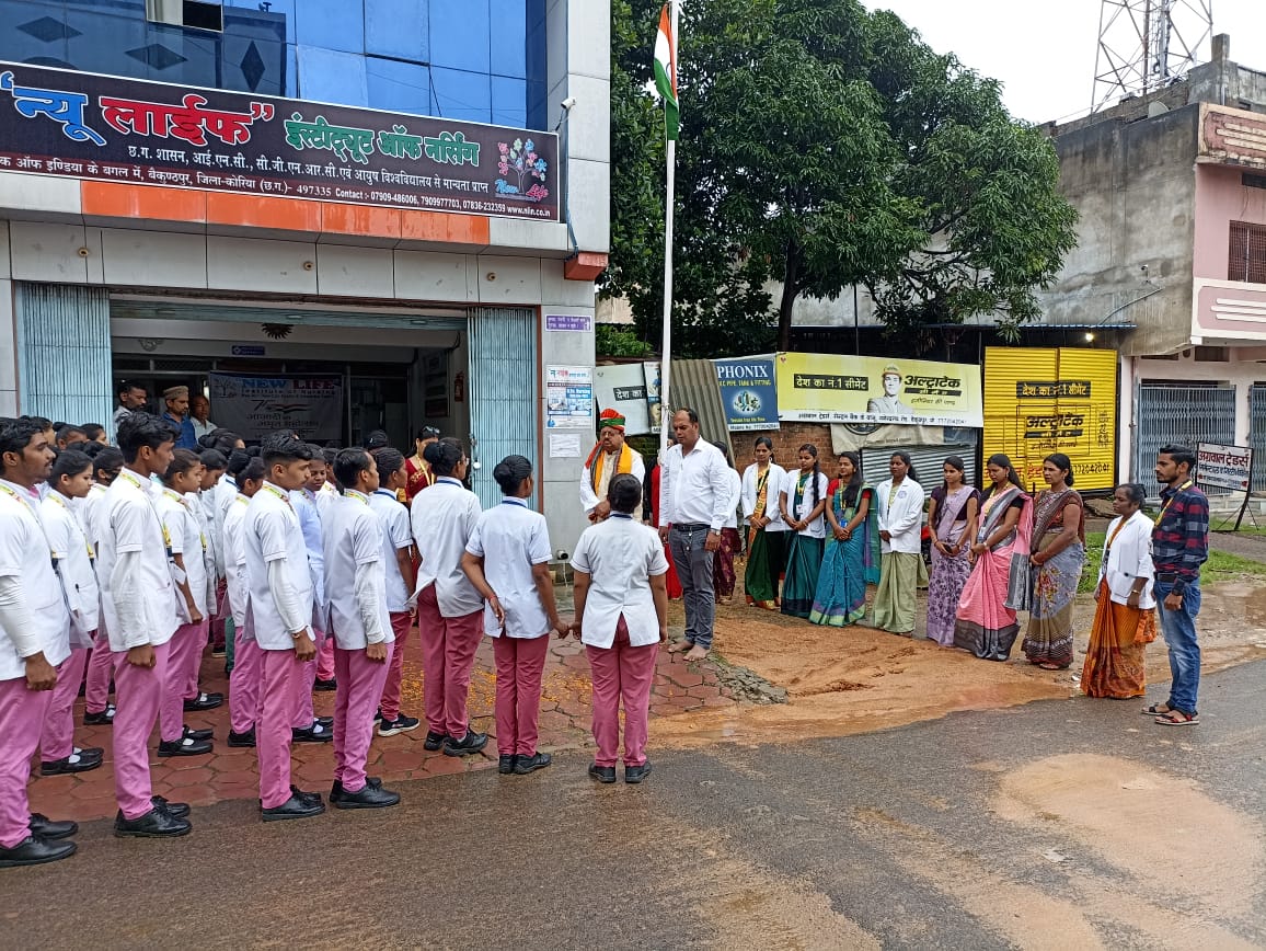 जिला कोरिया बैकुण्ठपुर- ”न्यू लाईफ” हेल्थ एंड एजुकेशन सोसायटी द्वारा संचालित न्यू लाईफ इंस्टीट्यूट आफ नर्सिंग बैकुण्ठपुर में स्वतंत्रता दिवस के अवसर पर ध्वजारोहण किया गया। इस वर्ष कोविड-19 महामारी को ध्यान में रखते हुए स्वतंत्रता दिवस समारोह का आयोजन भारत सरकार गृह मंत्रालय एवं स्वास्थ्य एवं परिवार कल्याण मंत्रालय के कोविड-19 से बचाव हेतु जारी सभी निर्देषो का पालन एवं उपाय बाध्याताओं एवं एहतियाती कदमों को ध्यान में रखते हुए दिषा निर्देषो अनुसार कार्यक्रम आयोजित किया गया, इस वर्ष कार्यक्रम के आयोजन में कटौती की गयी। ध्वजारोहण मुख्य अतिथी डाॅ. राकेष कुमार शर्मा, एवं डाॅ. प्रिंस जायसवाल के द्वारा किया गया। कार्यक्रम की शुरुवात मां सरस्वती, भारत माता एवं राष्ट्रपिता के पूजा अर्चना एवं दीप प्रज्जवलन के साथ हुआ। मुख्य अतिथीयों, नर्सिंग संस्थान के द्वारा राष्ट्र गान एवं झण्डा गीत गाया गया। कार्यक्रम का समापन मुख्य अतिथी डाॅ. राकेश कुमार शर्मा, एवं डाॅ. प्रिंस जायसवाल के उद्बोधन से हुआ। ध्वजारोहण में अतिथि के साथ में संस्था के प्राचार्य, नर्सिंग संस्थान के समस्त स्टाफ एवं छात्र छात्राऐं उपस्थित रहेे।