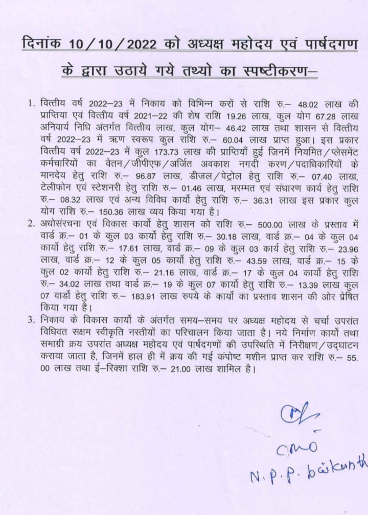 आज जो 88 लाख के आर्थिक नुकसान पहुंचाने की बात कही जा रही है इस संबंध में मैं साफ बताती हूं जिन लोगों के द्वारा हाई कोर्ट में भी याचिका लगाई गई थी जो हाई कोर्ट के द्वारा खारिज हो गया पार्षदाे के बहुमत प्रस्ताव पास किया गया था पहला बोली करता के द्वारा दुकानों के पैसा जमा नहीं किया गया शासन के नियमों के तहत कार्रवाई की गई थी