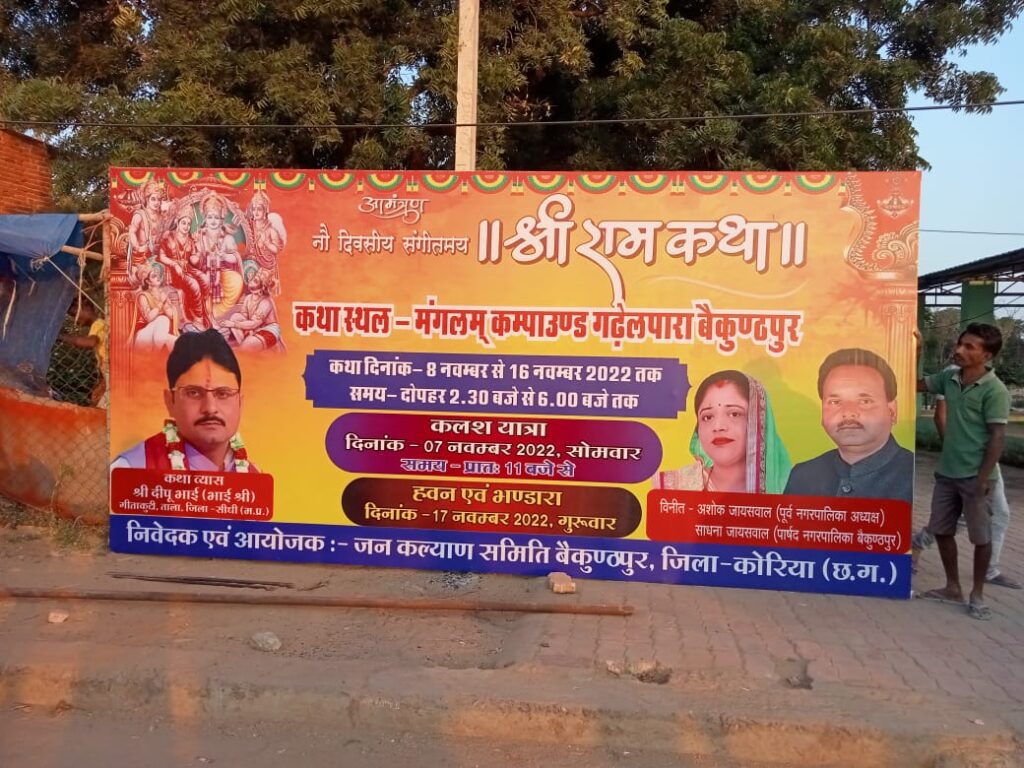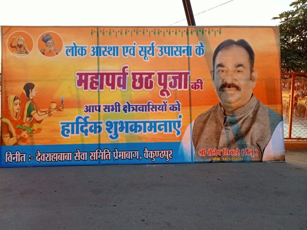 आपको बता दें कि इसी तरीके से छठ मैया का पूजा संपन्न 3 दिनों में पूरा होगी। आपको बता दें कि कांग्रेस पार्टी के नगर पालिका बैकुंठपुर के पूर्व अध्यक्ष अशोक जायसवाल जीने भी लगवाए हुडिंग दूसरी ओर भारतीय जनता पार्टी के पूर्व नगरपालिका अध्यक्ष शैलेश शिवहरे ने भी लगवाए हुडिंग बोर्ड।