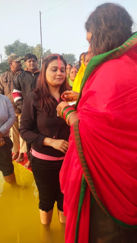 एसडीएम बैकुंठपुर डीएसपी कविता सिंह ठाकुर भी उगते सूर्य को अर्घ्य देने पहुंची