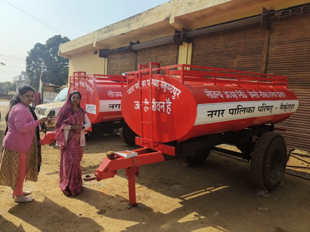 छत्तीसगढ़ जिला कोरिया बैकुंठपुर मुख्यालय के अंतर्गत नगर पालिका बैकुंठपुर की होनहार काम करने की काबिलियत उनमें भरा हुआ ऐसी है महिला अध्यक्ष श्रीमती नविता शैलेश शिवहरे के अध्यक्ष_निधि द्वारा 2 नग पानी टैंकर (5 हजार) लीटर जिसमे 1 नग टैंकर मे मोटर फ़िटिंग नगर पालिका परिषद को दिया व पूजा कर प्रारंभ किया गया।