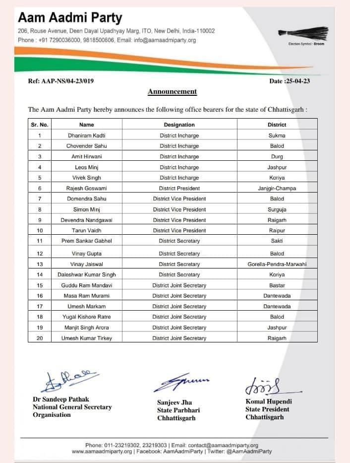 आम आदमी पार्टी ने की छत्तीसगढ़ के कार्यकारिणी की घोषणा.