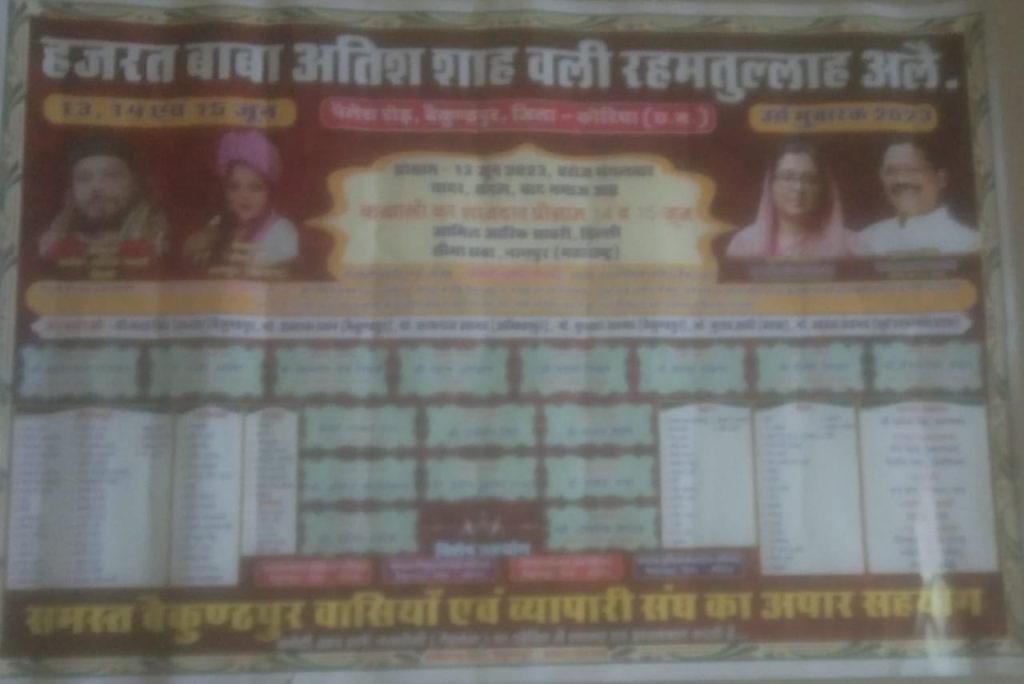 जिला कोरिया बैकुंठपुर मुख्यालय मैं रहने वाले पूर्व पार्षद अल्ताफ अहमद खान उर्फ छोटे खान के द्वारा बताया गया कि हर साल की भांति इस साल भी उर्स आतिश शाह बाबा के दरगाह शरीफ में आयोजन किया जा रहा है एवं समस्त क्षेत्र की जनता एवं कमेटी के मेंबर के द्वारा कार्यक्रम किया जा रहा है मुख्य अतिथि अमरजीत भगत कैबिनेट मंत्री छत्तीसगढ़ शासन मुख्य अतिथि अंबिका सिंह देव क्षेत्रीय विधायक बैकुंठपुर एवं संसदीय सचिव छत्तीसगढ़ शासन के होंगे।