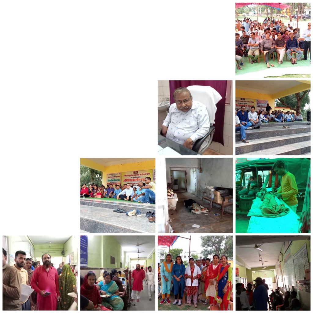 स्वास्थ्य विभाग के कर्मचारी अपने 24 सूत्रों मांगों को लेकर हड़ताल पर बैठे 2013 से उनके मांगों की नहीं की जा रही पूर्ति कई बार वार्तालाप भी किया गया लेकिन कोई फायदा नहीं कर्मियों के हड़ताल जाने से अस्पताल की व्यवस्था चरमरा गई यू कह सकते हैं कि खत्म हो गया व्यवस्था पूरा