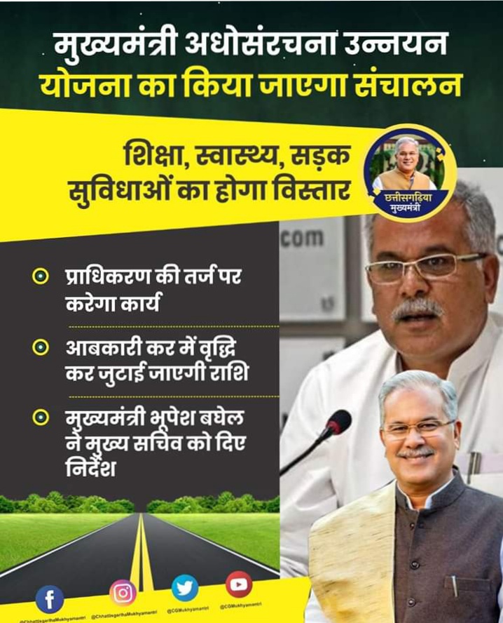 मुख्यमंत्री अधोसंरचना उन्नयन योजना का संचालन करने का फैसला लिया गया है, मुख्यमंत्री भूपेश बघेल ने मुख्य सचिव को इस हेतु आवश्यक निर्देश दिए है। मूलभूत सुविधाओं के विस्तार हेतु प्राधिकरण की तर्ज पर इस योजना का संचालन किया जाएगा, इससे जनता को आवश्यक सुविधाएं मिलेंगी।