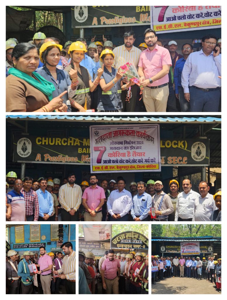 आज कलेक्टर व जिला निर्वाचन अधिकारी श्री विनय कुमार लंगेह जिला पंचायत सीईओ व स्वीप कार्यक्रम के नोडल अधिकारी डॉ. आशुतोष चतुर्वेदी, चरचा माइन पहुंच कर यहां कार्यरत श्रमवीरों को 7 मई को होने वाले मतदान के लिए आमंत्रण पत्र एवं बुके प्रदान किए। इस अवसर पर बड़ी संख्या में महिला कर्मचारी, अधिकारी भी उपस्थित थीं।