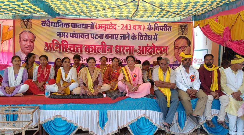 5वी अनुसूची क्षेत्रों में ग्राम पंचायतों को नगर पंचायत बनाया जाना असंवैधानिक है :- यह कहते हुए पटना ग्राम पंचायत संघर्ष समिति के बैनर तले विगत 10 दिनों से कार्यालय ग्राम पंचायत के सामने ग्राम वासी धरना आंदोलन जारी किये हुए हैं।