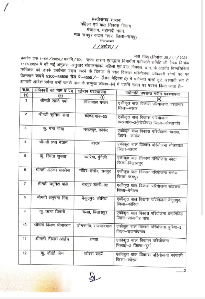 राज्य शासन के द्वारा पदोन्नति दिनांक 20/11/2024 को परियोजना अधिकारी के पद पर अनुपमा सिंह