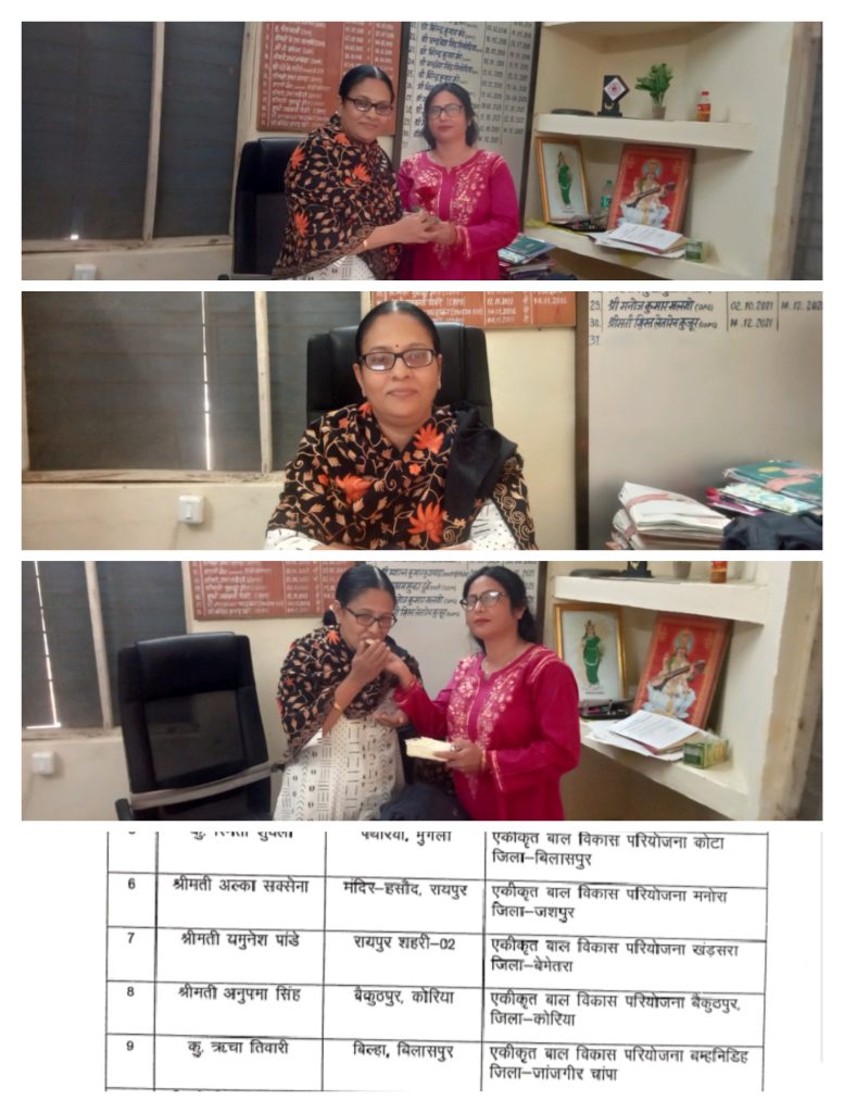 आपको बता दें कि अनुपमा सिंह को बैकुंठपुर जिला कोरिया में एकीकृत बाल विकास परियोजना में पदोन्नति कर परियोजना अधिकारी बनाया गया विभाग के द्वारा शुभकामनाएं दी जा रही और अनुपमा सिंह की मां बहन परिवार,एवं अनुपमा सिंह के मित्रगण के द्वारा कौल कर के बधाई एवं शुभकामनाएं दी जा रही है।