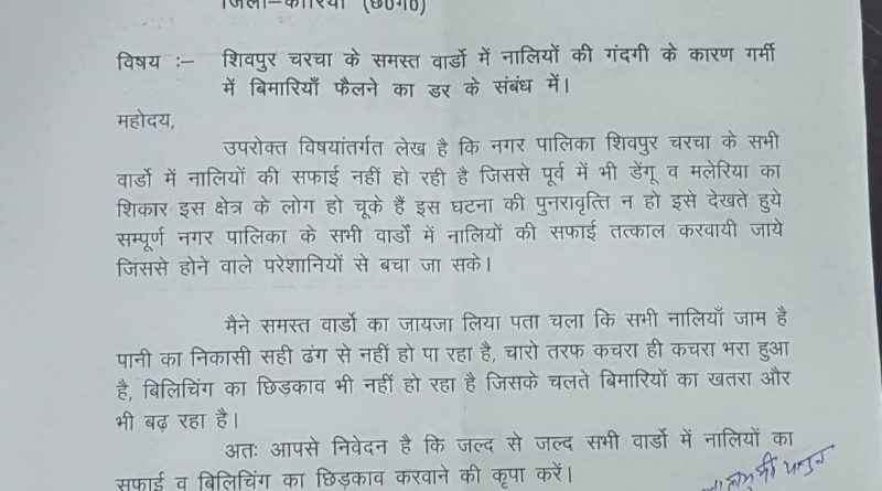 जिला कोरिया चर्चा के वार्डो के नालियों की सफाई नहीं की जा रही जिससे पूर्व में भी डेंगू एवं मलेरिया का शिकार हो चुके थे क्षेत्र के जनता जनार्दन,, दोबारा ऐसा ना हो क्षेत्र में ,,, इसको देखते हुए नेता प्रतिपक्ष लालमुनि यादव ने संपूर्ण नगर पालिका के सभी वार्डों में नालियों की सफाई तत्काल कराए जाने की नगर पालिका अधिकारी को पत्र लिखकर बताया दिनांक 7.4.2025 को ,,, शिवपुर नगर पालिका के सीएमओ ऑफिस में बैठकर आनंद ले रहे हैं एसी का,,,, नेता प्रतिपक्ष लालमुनि यादव के द्वारा चर्चा के समस्त वार्डों का जायजा लिया गया तब पता चला कि सभी नालियां जाम है पानी का निकासी सही ढंग से नहीं हो पा रहा चारों तरफ कचरा ही कचरा भरा हुआ है ब्लीचिंग का छिड़काव भी नहीं हो रहा जिसके चलते बीमारी का खतरा क्षेत्र वासियों के जीवन पर मंडराता नजर आ रहा है । आपको बता दें कि देखना यह होगा कि नगर पालिका चर्चा के सीएमओ अपने कर्तव्य के प्रति सजक कितना रहेंगे कि नहीं।
