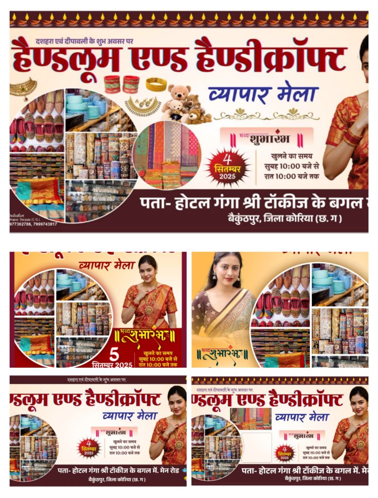 व्यापार मेला हैंडलूम एण्ड हैंडिक्राफ्ट का शुभारंभ आस्तित्व शुक्ला अभिषेक शुक्ला दोनों भाइयों के दारा गणेश जी की पूजा कर शुभारंभ किया गया है हमारे देश की कला को प्रदर्शित करता है व्यापार मेला पता होटल गंगा श्री टॉकीज के बगल में मेन रोड बैकुंठपुर जिला कोरिया