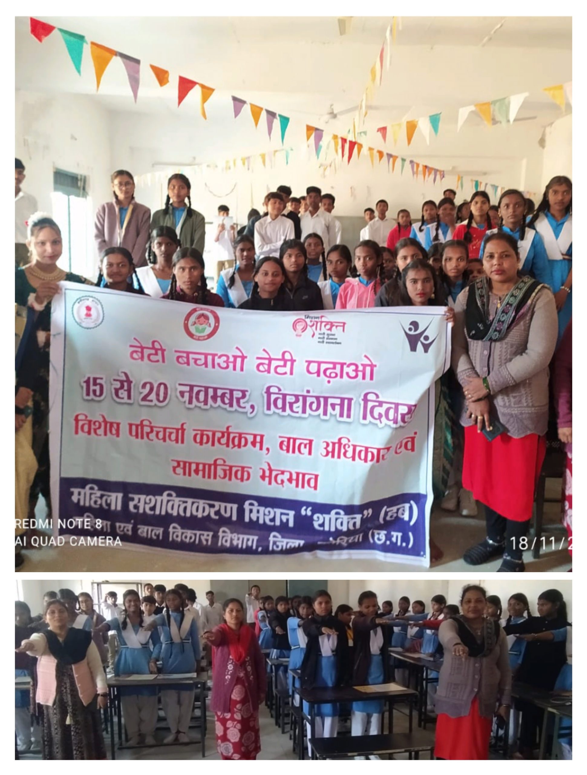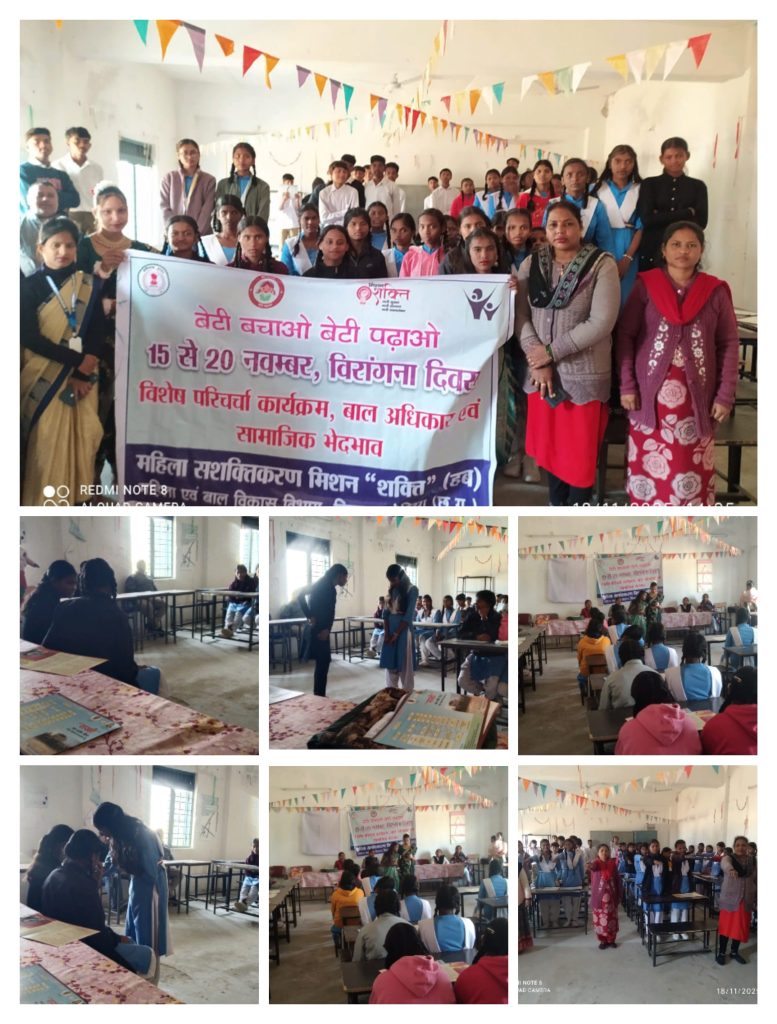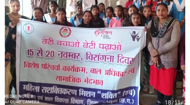 जिला कोरिया,,बेटी पढ़ाओ बेटी बचाओ महिला बाल विकास बैकुंठपुर : आज दिनांक 18/11/2025 को कोरिया कलेक्टर श्रीमती चंदन संजय त्रिपाठी मैम के निर्देशानुसार जिला कार्यक्रम अधिकारी श्री एन एस रावटे के मार्गदर्शन में शासकीय हाई स्कूल छिंदिया में बेटी बचाओ बेटी पढ़ाओ योजना अंतर्गत वीरांगना दिवस के अवसर पर विशेष परिचर्चा कार्यक्रम का आयोजन किया गया। जिसमें बालिकाओं के द्वारा बाल अधिकार एवं सामाजिक भेदभाव विषय पर परिचर्चा किया गया। आज के कार्यक्रम में बालिकाओं के द्वारा वीरांगनाओं की वेशभूषा धारण करते हुए कार्यक्रम की प्रस्तुति दी गई। आज के कार्यक्रम में परिचर्चा के साथ ही महिला एवं बाल विकास विभाग द्वारा संचालित अन्य योजना जैसे सखी वन स्टॉप सेंटर, शक्ति सदन, प्रधानमंत्री मातृत्व वंदना योजना, दहेज प्रतिषेध अधिनियम, महतारी बंधन योजना एवं अन्य संचालित योजनाओं के बारे में विस्तृत रूप से जानकारी दी गई।