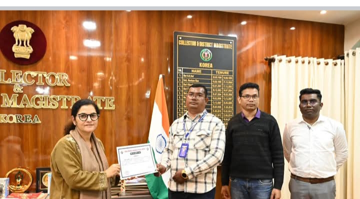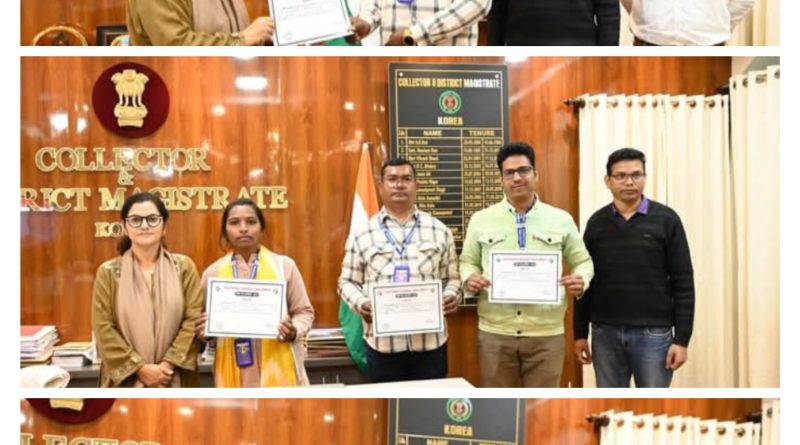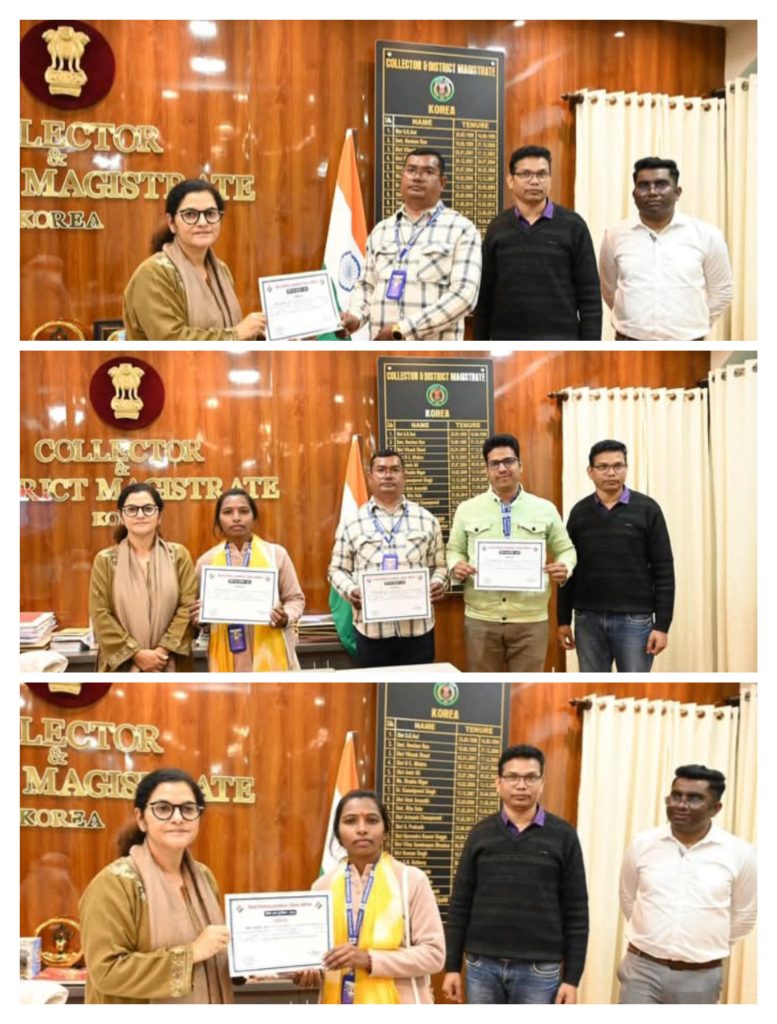 कोरिया जिले में विशेष गहन पुनरीक्षण अभियान (SIR) में उत्कृष्ट एवं समयपूर्व शत-प्रतिशत कार्य करने वाले बीएलओ को कलेक्टर श्रीमती चंदन त्रिपाठी ने किया सम्मानित।