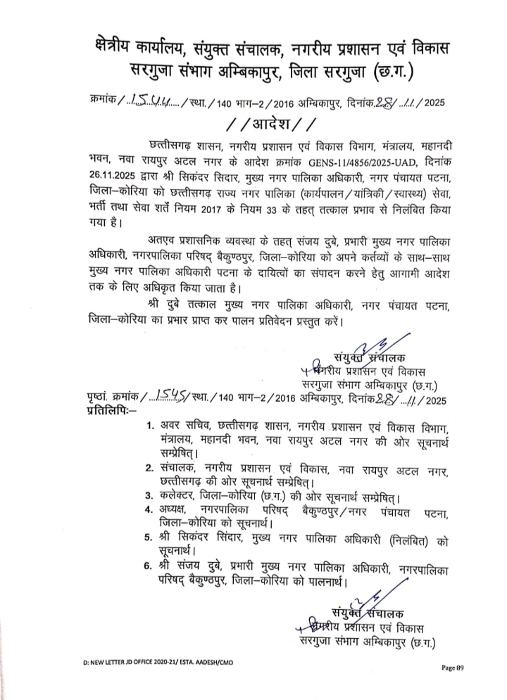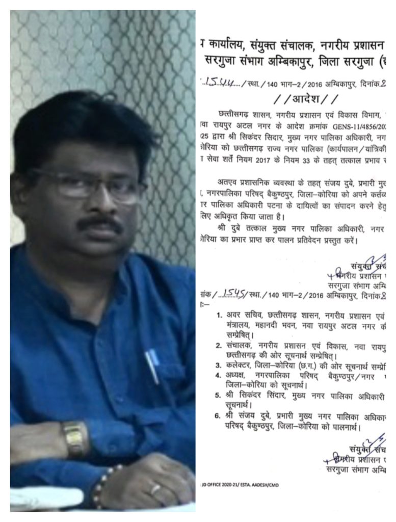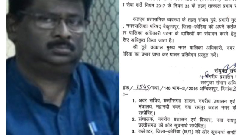 अतिरिक्त प्रभार दिया गया नगर पंचायत पटना का CMO संजय दुबे को, पदस्थ नपा बैकुंठपुर में