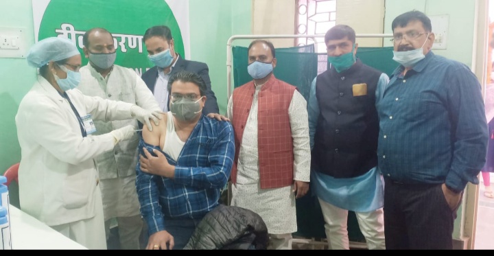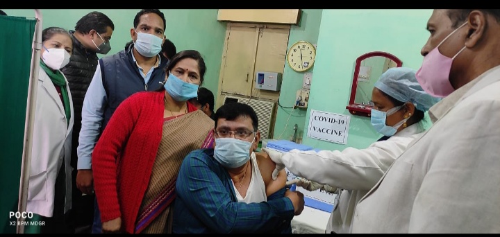 शहरी प्राथमिक स्वास्थ्य केंद्र डोमनहिल चिरमिरी में आज कोविड-19 वैक्सीनेशन के प्रथम चरण का टीका वरिष्ठ चिकित्सा अधिकारी डॉक्टर जयंत यादव को लगाया गया। इस अवसर पर मनेंद्रगढ़ विधानसभा क्षेत्र के विधायक डॉ विनय कुमार जयसवाल, नगर निगम चिरमिरी महापौर श्रीमती कंचन जायसवाल सहित अन्य अधिकारी और कर्मचारी उपस्थित थे।