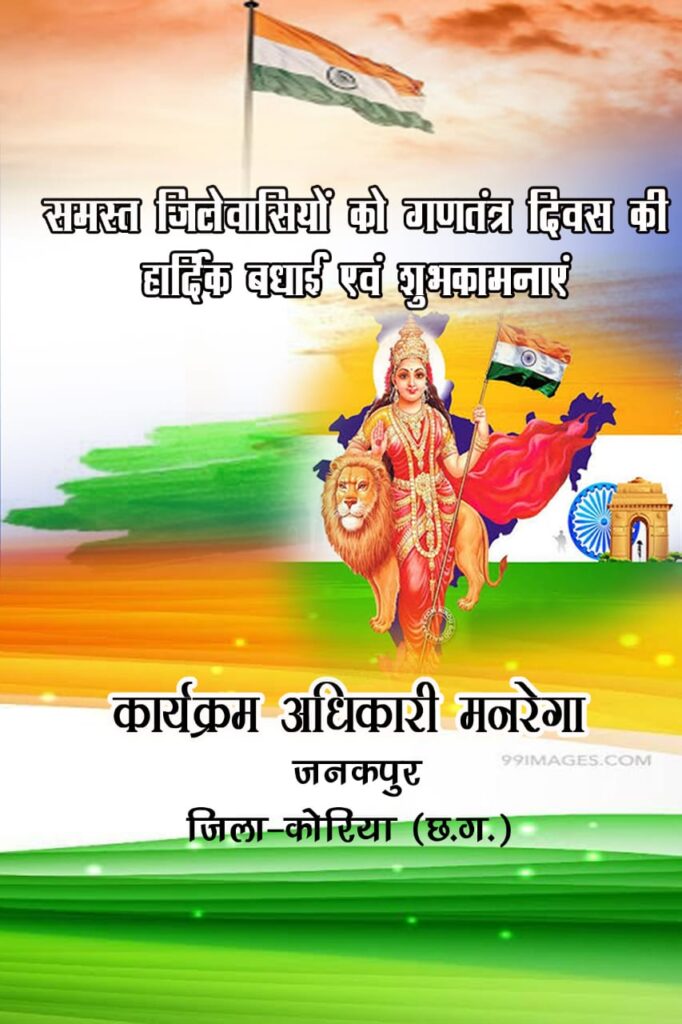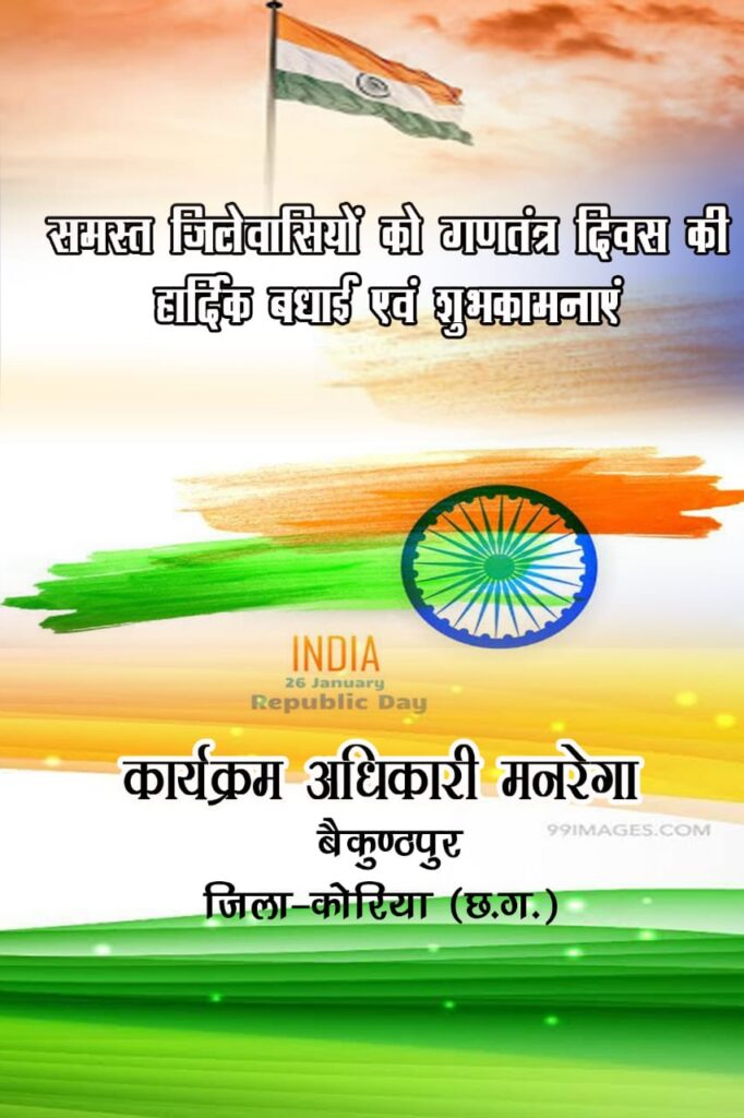 कोरिया छत्तीसगढ़ कोरिया जिला के समस्त क्षेत्रवासियों को गणतंत्र दिवस की हार्दिक बधाई एवं शुभकामनाएं कार्यक्रम अधिकारी मनरेगा जिला कोरिया छत्तीसगढ़ की तरफ से January 25, 2021January 25, 2021 Kamrun Nisha 0 Comments कमरून निशा कोरिया जिला के समस्त क्षेत्रवासियों को गणतंत्र दिवस की हार्दिक बधाई एवं शुभकामनाएं कार्यक्रम अधिकारी मनरेगा जिला कोरिया छत्तीसगढ़ की तरफ से WhatsApp Facebook Twitter LinkedIn
