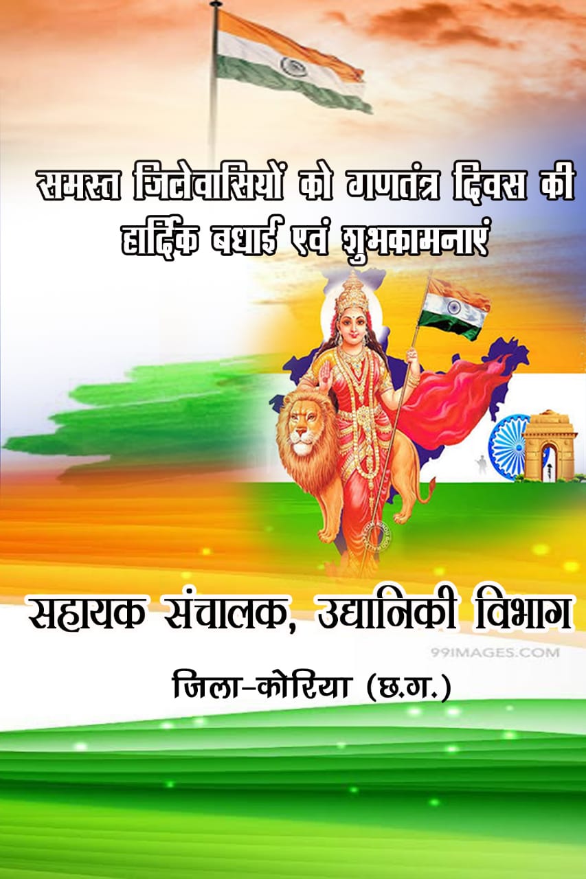 समस्त कोरिया जिला के देशवासियों को गणतंत्र दिवस की हार्दिक बधाई एवं शुभकामनाएं सहायक संचालक उद्यानिकी विभाग जिला कोरिया छत्तीसगढ़ की ओर से