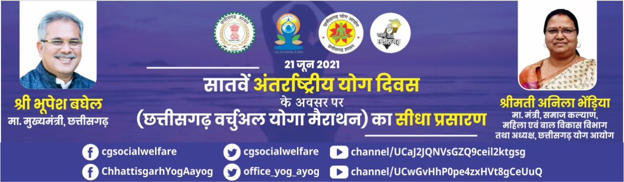 कोरिया 20 जून 2021/ अंतर्राष्ट्रीय योग दिवस के अवसर पर आयोजित ’’छत्तीसगढ़ वर्चुअल योग मैराथन’’ कार्यक्रम का सीधा प्रसारण 21 जून के प्रातः 6.45 से 22 जून के प्रातः 07 बजे तक 24 घण्टे समाज कल्याण विभाग एवं छत्तीसगढ़ योग आयोग के सोशल मीडिया प्लेटफार्म-यूट्यूब चैनल, फेसबुक पेज एवं ट्वीटर एकाउंट पर किया जायेगा।