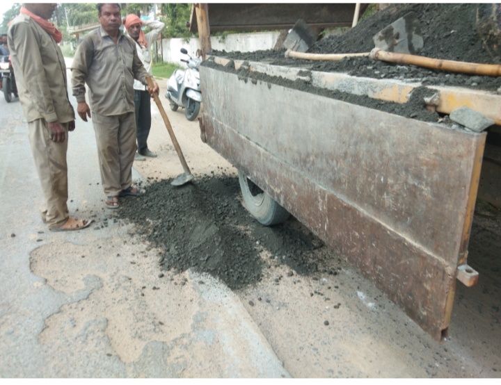 कोरिया जिले के प्रभारी मंत्री श्री ताम्रध्वज साहू जी के आगमन पर सड़कों मे जाे गड्ढे है मरम्मत गड्ढों की जा रही है