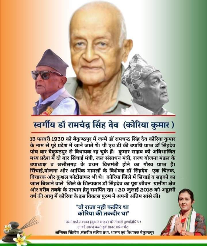 छत्तीसगढ़ जिला कोरिया बैकुंठपुर के महारानी साहब संसदीय सचिव अंबिका सिंहदेव दीदी जीजा जी समस्त कांग्रेस के कार्यकर्ता के द्वारा कोरिया जिले केभाग्यविधाता छत्तीसगढ़ के प्रथमवित्त मंत्री स्व. कोरिया कुमार जी को तृतीय पुण्य तिथि पर स्व. कोरिया कुमार जी को विनम्र_श्रद्धांजलि.. अर्पित किया गया कोरिया पैलेस में स्व. कोरिया कुमार जी के