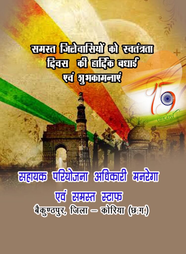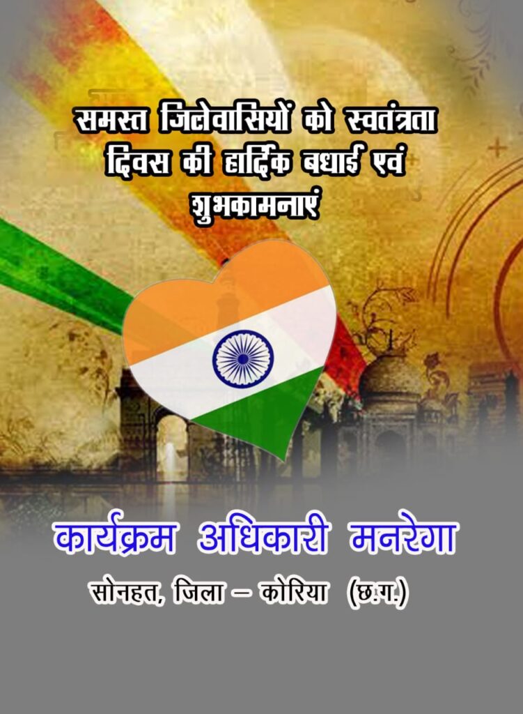 new कोरिया छत्तीसगढ़ कार्यक्रम अधिकारी मनरेगा के आेर से कोरिया जिला के समस्त देशवासियों को स्वतंत्रता दिवस की हार्दिक शुभकामनाएं,, August 14, 2021August 14, 2021 Kamrun Nisha 0 Comments kamrun nisha WhatsApp Facebook Twitter LinkedIn