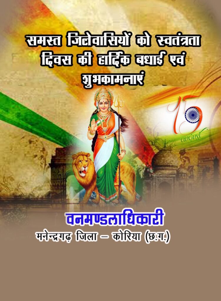 new कोरिया छत्तीसगढ़ वनमंडलाधिकारी मनेंद्रगढ़ जिला कोरिया की ओर से समस्त देशवासियों को स्वतंत्रता दिवस की हार्दिक शुभकामनाएं August 14, 2021August 14, 2021 Kamrun Nisha 0 Comments कमरून निशा वनमंडलाधिकारी मनेंद्रगढ़ जिला कोरिया की ओर से समस्त देशवासियों को स्वतंत्रता दिवस की हार्दिक शुभकामनाएं WhatsApp Facebook Twitter LinkedIn