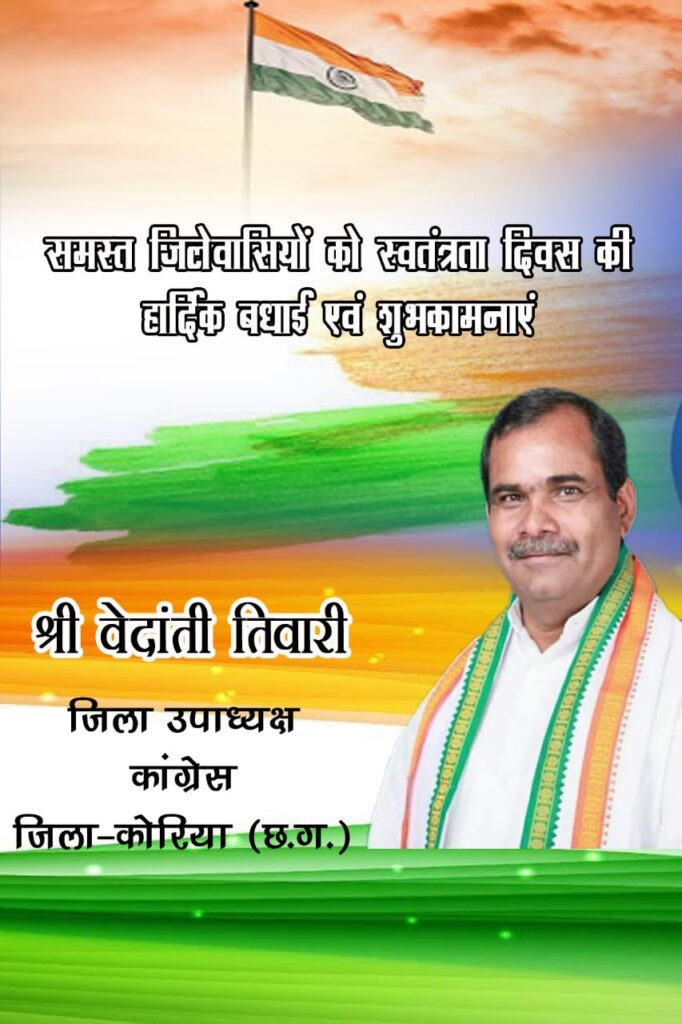 new कोरिया छत्तीसगढ़ श्री वेदांती तिवारी जी कोरिया जिला पंचायत उपाध्यक्ष की ओर से समस्त क्षेत्रवासियों को स्वतंत्रता दिवस की हार्दिक शुभकामनाएं August 14, 2021August 14, 2021 Kamrun Nisha 0 Comments कमरून निशा WhatsApp Facebook Twitter LinkedIn