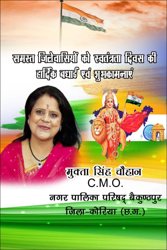 मुक्ता सिंह चौहान C,m,O, नगर पालिका परिषद बैकुंठपुर जिला कोरिया की ओर से पूरे नगर पालिका अधिकारी कर्मचारी एवं समस्त कोरिया जिला के नागरिकजनाे को स्वतंत्रता दिवस की हार्दिक शुभकामनाएं,,,