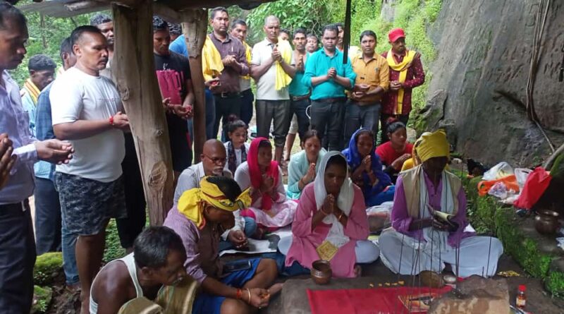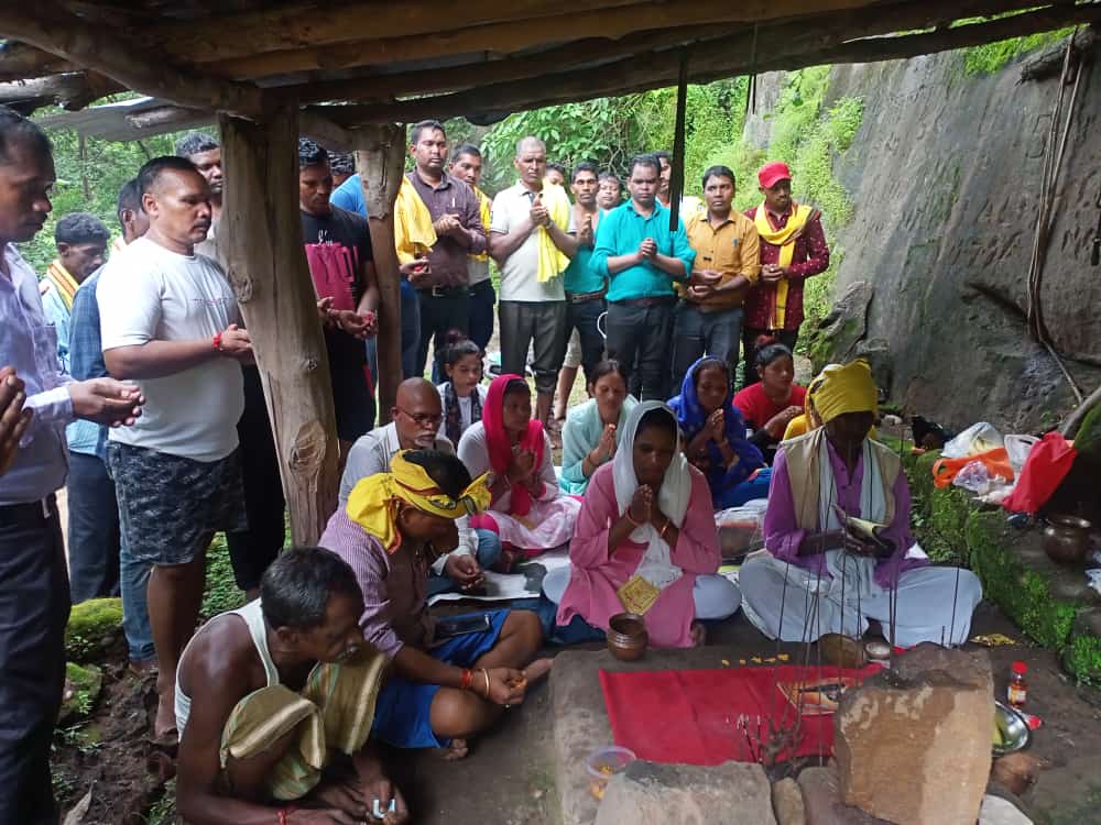 हेडिंग – कोड़या के आदिवासी समाज अपने मूल धरोहर को देखने पहुंचे, घनाघोर जंगल, प्राकृतिक चट्टानों पथरीली उद्गम स्थान पर चड़ कर पूजा किए।