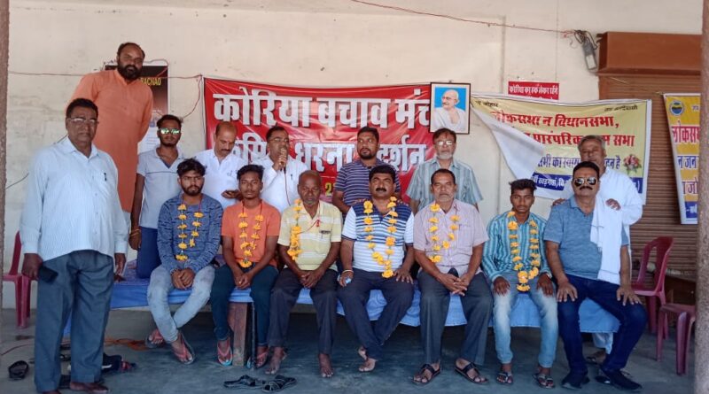 कोरिया बचाओ मंच के बैनर तले बैठे हुए धरना प्रदर्शन में पूर्व जिला मंडल अध्यक्ष सुरेंद्र चक्रधारी अनिल खटीक यस सेन पटेल बालकृष्ण विशाल देवांगन
