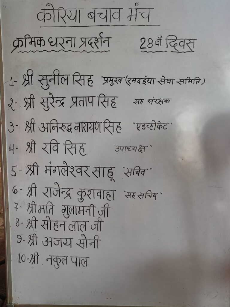 सुनील सिंह प्रमुख रमदईया सेवा समिति सुरेंद्र प्रताप सिंह सह, संरक्षक अनिरुद्ध नारायण सिंह एडवोकेट रवि सिंह उपाध्यक्ष समस्त कोरिया बचाव मंच क्रमिक धरना प्रदर्शन बैठे हैं 28वां दिन इतिहास गवाह है एक-एक दिन का इंसाफ की लड़ाई में